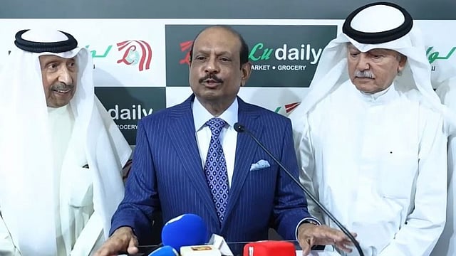 എം.എ. യൂസഫലി മാധ്യമ പ്രവർത്തകരോടു സംസാരിക്കുന്നു.
