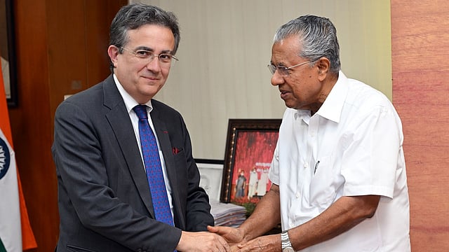 ഇന്ത്യയിലെ ഫ്രഞ്ച് അംബാസിഡർ തിയെറി മതൗ മുഖ്യമന്ത്രി പിണറായി വിജയനെ സന്ദർശിച്ചപ്പോൾ
