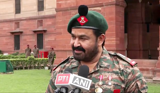 കരസേനാ മേധാവിയെ സന്ദർശിച്ച ശേഷം മോഹൻലാൽ മാധ്യമ പ്രവർത്തകരോടു സംസാരിക്കുന്നു.