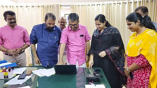 പൊങ്കാലയോടനുബന്ധിച്ച് ഭക്ഷണ സാധനങ്ങള് വിതരണം ചെയ്യുന്നവര്ക്ക് നഗരസഭയില് രജിസ്റ്റര് ചെയ്യുന്നതിലേക്കായുള്ള പോര്ട്ടല് മന്ത്രി എം.ബി. രാജേഷ് ഉദ്ഘാടനം ചെയ്യുന്നു. മന്ത്രി വി. ശിവൻകുട്ടി, മേയർ ആര്യ രാജേന്ദ്രൻ തുടങ്ങിയവർ സമീപം.