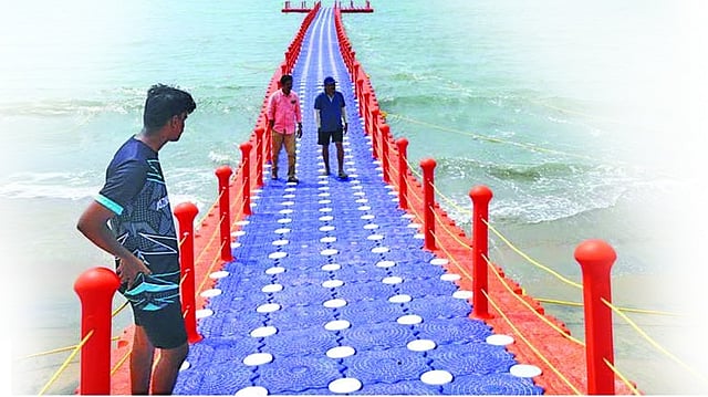 കൊച്ചി: കുഴുപ്പിള്ളി ബീച്ചില് തിരകള്ക്കൊപ്പം നടക്കാന് ഇനി ഫ്ലോട്ടിങ് ബ്രിഡ്ജ്. എറണാകുളം ജില്ലയിലെ ടൂറിസം മേഖലയ്ക്ക് പുത്തന് ഉണര്വേകുന്നതാണ് ഈ സാഹസിക ടൂറിസം. തീരത്ത് നിന്ന് കടലിലേക്ക് നൂറ് മീറ്റര് നീളത്തിലും മൂന്ന് മീറ്റര് വീതിയിലുമാണ് പാലം നിര്മിച്ചിരിക്കുന്നത്. 1.3 കോടി ചെലവിലാണ് ടൂറിസം വകുപ്പ് ഫ്ലോട്ടിങ് ബ്രിഡ്ജ് കുഴിപ്പിള്ളിയില് വിനോദ സഞ്ചാരികള്ക്കായി ഒരുക്കിയിരിക്കുന്നത്.