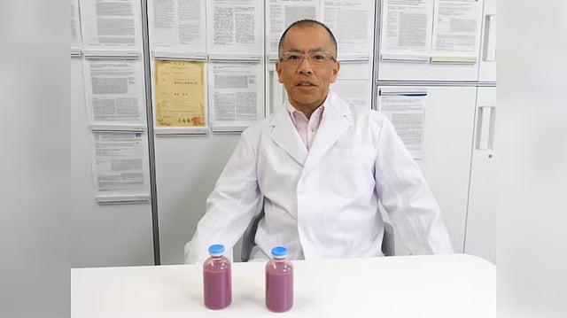 ഹിരോമി സകായ് താൻ വികസിപ്പിച്ച കൃത്രിമ രക്തവുമായി