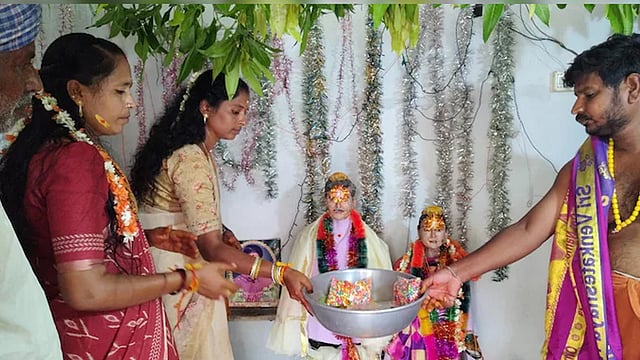 മഹാബുബാബാദ്: മകൻ ജീവനോടെയില്ലെങ്കിലും 23 വർഷമായി മകന്റെ വിവാഹച്ചടങ്ങ് ആഘോഷമായി നടത്തി മാതാപിതാക്കൾ. തെലങ്കാനയിലാണ് മകന്റെ മരണശേഷവും മാതാപിതാക്കൾ വിവാഹം നടത്തുന്നത്. തെലങ്കാനയിലെ മഹാബുബാബാദ് ജില്ലയിലെ താമസക്കാരായ ലാലു, സുക്കമ്മ എന്നിവരാണ് മരണമടഞ്ഞ മകൻ റാം കോട്ടിയുടെ വിവാഹച്ചടങ്ങ് വർഷാവർഷം ആചാരപ്രകാരം നടത്തുന്നത്.