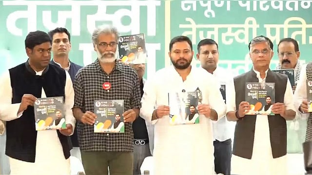 ഇന്ത്യ മുന്നണിയുടെ പ്രകടനപത്രിക തേജസ്വി യാദവ് പ്രകാശനം ചെയ്യുന്നു.