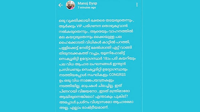 ഡിവൈ.എസ്പി ആർ. മനോജ് കുമാറിന്റെ വാട്ട്സാപ്പ് സ്റ്റാറ്റസ്.