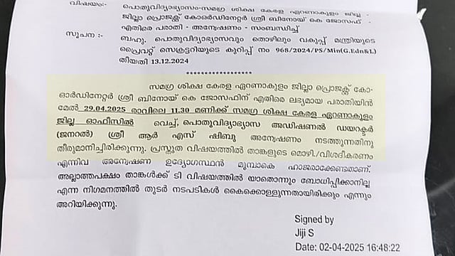 കൊച്ചി: സമഗ്ര ശിക്ഷാ കേരള പദ്ധതിയുടെ എറണാകുളം ജില്ലാ പ്രോജക്റ്റ് കോഓർഡിനേറ്റർ ബിനോയ് കെ. ജോസഫ് ഉത്തരവ് ലംഘിച്ച് പദവിയിൽ തുടരുന്നതായി ആരോപണം. എറണാകുളം കോഓർഡിനേറ്ററായി തുടരുന്ന ബിനോയുടെ ഡെപ്യൂട്ടേഷൻ കാലാവധി 2025 മാർച്ചിൽ അവസാനിച്ചു. എന്നാൽ, ഇതു സംബന്ധിച്ച ഉത്തരവ് പൂഴ്ത്തി ഇപ്പോഴും അതേ പദവിയിൽ തന്നെ തുടരുന്നതായാണ് ആരോപണം ഉയർന്നിരിക്കുന്നത്.