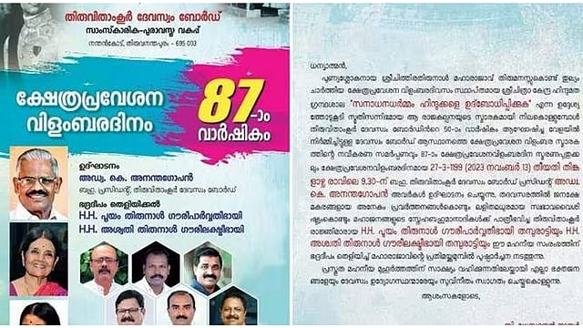 ഇന്നലെ നടന്ന നവീകരിച്ച ക്ഷേത്രപ്രവേശന വിളംബര സ്മാരകത്തിന്റെ സമർപ്പണച്ചടങ്ങിൽ ബോർഡിന്റെ സാംസ്കാരിക - പുരാവസ്തു വിഭാഗം മേധാവി ബി. മധുസൂദനൻ നായരും പങ്കെടുത്തില്ല.