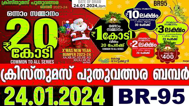 24 ഉച്ചയ്ക്ക് രണ്ടിനാണു നറുക്കെടുപ്പ്. മുന് വര്ഷം 16 കോടി രൂപയായിരുന്ന ഒന്നാം സമ്മാനത്തിന്റെ സ്ഥാനത്ത് ഇക്കുറി പത്തു സീരീസുകളിലെ ടിക്കറ്റുകളില് ഒന്നാം സമ്മാനമായി നല്കുന്നത് 20 കോടി രൂപയാണ്. രണ്ടാം സമ്മാനം 20 പേർക്ക് ഒരുകോടി വീതം. 30 പേര്ക്ക് 10 ലക്ഷം രൂപ വീതം നല്കുന്ന മൂന്നാം സമ്മാനവും (ആകെ മൂന്നു കോടി-ഓരോ സീരീസുകളിലും മൂന്ന് സമ്മാനം), 20 പേര്ക്ക് 3 ലക്ഷം രൂപ വീതം നല്കുന്ന നാലാം സമ്മാനവും (ആകെ 60 ലക്ഷം- ഓരോ സീരീസുകളിലും രണ്ട് സമ്മാനം), 20 പേര്ക്ക് 2 ലക്ഷം രൂപ വീതം നല്കുന്ന അഞ്ചാം സമ്മാനവും (ആകെ 40 ലക്ഷം- ഓരോ സീരീസുകളിലും രണ്ട് സമ്മാനം) മുതല് അവസാന നാലക്കത്തിന് 400 രൂപ ഉറപ്പാക്കുന്ന സമ്മാനങ്ങളും നിശ്ചയിച്ചിട്ടുണ്ട്. 3 ലക്ഷത്തിലധികം സമ്മാനങ്ങളായിരുന്നു 2022-23ലെ ക്രിസ്മസ്-ന്യൂ ഇയര് ബംപറിന് ഉണ്ടായിരുന്നത്. മുന് വര്ഷത്തെക്കാള് മൂന്ന് ലക്ഷത്തിലധികം സമ്മാനങ്ങളാണ് ഇക്കുറി ക്രിസ്മസ്-ന്യൂ ഇയര് ബംപറില് കൂട്ടിച്ചേര്ത്തിരിക്കുന്നത്. ആകെ 6 ലക്ഷത്തിലധികം സമ്മാനങ്ങള്. 400 രൂപയാണ് ഒരു ടിക്കറ്റിന് വില. ഒന്നാം സമ്മാനാര്ഹമാകുന്ന ടിക്കറ്റിന്റെ മറ്റ് ഒന്പതു സീരീസുകളിലെ അതേ നമ്പരുകള്ക്ക് സമാശ്വാസ സമ്മാനമായി ഒരു ലക്ഷം രൂപ വീതം ലഭിക്കും.