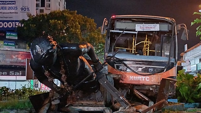 യാത്രക്കാരുടെ പരുക്ക് ഗുരുതരമല്ല. കോഴിക്കോട്ടേക്ക് പോവുകയായിരുന്ന ബസാണ് അപകടത്തിൽപെട്ടത്. സ്ഥലത്തുനിന്നു ബസ് മാറ്റുന്നതിനുള്ള ശ്രമങ്ങള് ആരംഭിച്ചു. പ്രതിമ നേരെയാക്കാനുള്ള പ്രവർത്തനങ്ങൾ ഇന്ന് നടത്തുമെന്ന് അധികൃതർ അറിയിച്ചു.