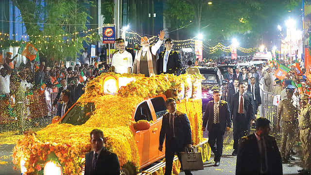 പൂക്കളാല് അലങ്കരിച്ച തുറന്ന വാഹനത്തിൽ കയറി ആരംഭിച്ച മെല്ലെയുള്ള യാത്ര അത്യാവേശകരമായിരുന്നു. പൂക്കള് വിതറിയും കൈകള് വീശിയും മുദ്രവാക്യം വിളിച്ചുമാണ് മോദിയെ വൻ ജനാവലി അദ്ദേഹത്തെ സ്വീകരിച്ചത്. റോഡിനിരുഭാഗവും അണിനിരന്ന സ്ത്രീകളും കുട്ടികളും അടക്കമുള്ളവരെ മോദി അഭിവാദ്യം ചെയ്തു. ബിജെപി സംസ്ഥാന പ്രസിഡന്റ് കെ. സുരേന്ദ്രനും തുറന്ന വാഹനത്തില് അനുഗമിച്ചു.