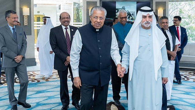 മുഖ്യമന്ത്രി പിണറായി വിജയനെ യുഎഇയിൽ സ്വീകരിച്ചപ്പോൾ.