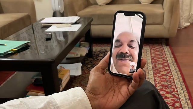 കെ.സി. വേണുഗോപാൽ എംപിയുമായി വീഡിയോ കോളിൽ സംസാരിക്കുന്ന ജി.പി. കുഞ്ഞബ്ദുള്ള.