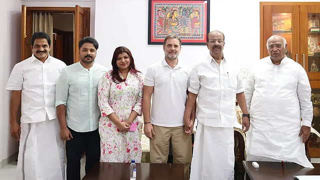 സുധാകരനും കുടുംബവും രാഹുൽ ഗാന്ധിക്കൊപ്പം. മല്ലികാർജുൻ ഖാർഗെയും കെ.സി. വേണുഗോപാലും ഒപ്പം.