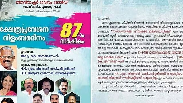 തിരുവന്തപുരം: ദേവസ്വം ബോർഡ് ക്ഷേത്രപ്രവേശന വിളംബരത്തിന്റെ വാർഷികപരിപാടിയിൽ തിരുവിതാംകൂറിലെ മുൻ രാജകുടുംബം പങ്കെടുത്തില്ല. പരിപാടിയുടെ നോട്ടീസ് വിവാദമായതിന് പിന്നാലെയാണ് തീരുമാനം.