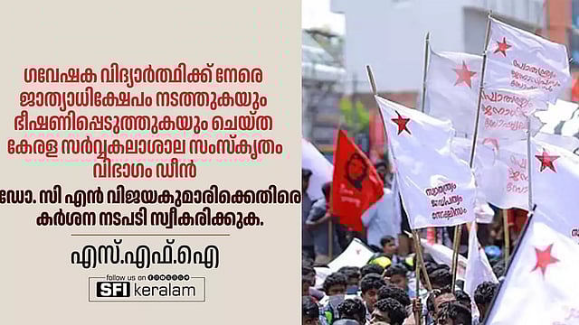 തിരുവനന്തപുരം: കേരള സർവകലാശാലയിൽ ജാതി അധിക്ഷേപം നേരിട്ടെന്ന ഗവേഷക വിദ്യാർഥിയുടെ ആരോപണത്തിൽ സംസ്കൃതം വകുപ്പ് മേധാവിക്കെതിരേ നടപടി സ്വീകരിക്കണമെന്ന് എസ്എഫ്ഐ.