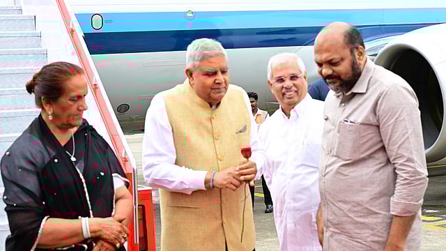 കൊച്ചി: രണ്ടു ദിവസത്തെ കേരള സന്ദർശനത്തിനെത്തിയ ഉപരാഷ്ട്രപതി ജഗദീപ് ധൻകറിന് കൊച്ചി അന്താരാഷ്ട്ര വിമാനത്താവളത്തിൽ ഹൃദ്യമായ സ്വീകരണം. ഭാര്യ ഡോ. സുധേഷ് ധൻകറിനൊപ്പം വ്യോമസേനയുടെ പ്രത്യേക വിമാനത്തിൽ എത്തിയ ഉപരാഷ്ട്രപതിയെ ഗവർണർ രാജേന്ദ്ര വിശ്വനാഥ് ആർലേക്കറിന്റെ നേതൃത്വത്തിലാണ് സ്വീകരിച്ചത്. കുടുംബാംഗങ്ങളായ ആഭാ വാജ്പെയ്, കാർത്തികേയ് വാജ്പെയ് എന്നിവരും ഒപ്പമുണ്ടായിരുന്നു.