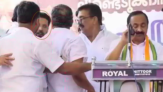 വി.ഡി. സതീശനെ പ്രസംഗിക്കാൻ വിളിച്ചപ്പോൾ ഷാഫി പറമ്പിൽ പ്രകോപിതനായി വേദിയിൽ നിന്ന് ഇറങ്ങിപ്പോകാൻ ശ്രമിക്കുന്നു.