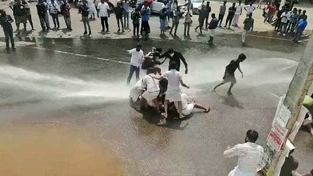 ഈ ബാരിക്കേഡ് മറികടക്കുന്നതിനിടെയാണ് പ്രവർത്തകർ പൊലീസിന് നേരെ വെള്ളം നിറച്ച ബലൂണുകൾ എറിഞ്ഞത്. തുടർന്ന് നടന്ന സമ്മേളനം തിരുവഞ്ചൂർ രാധാകൃഷ്ണൻ എംഎൽഎ ഉദ്ഘാടനം ചെയ്തു. ഇതിനുശേഷവും പ്രവർത്തകർ പൊലീസിന് നേരെ വാട്ടർ ബലൂണുകൾ പ്രയോഗിച്ചതോടെയാണ് പൊലീസ് ജലപീരങ്കി പ്രയോഗിച്ചത്. പിന്നീട് പ്രവർത്തകർ കൈയ്യിൽ കിട്ടിയതെല്ലാം കൊണ്ട് പൊലീസിനു നേരെ വലിച്ചെറിഞ്ഞു.