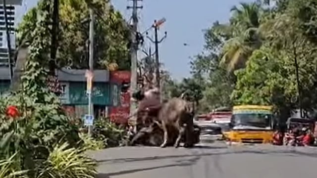 എയർപോർട്ട് റോഡിൽ സ്കൂട്ടർ യാത്രക്കാരനെ കുത്തി മറിച്ചിടുന്ന പോത്ത്.