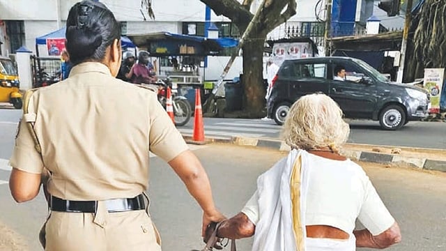 സെക്രട്ടേറിയറ്റിനു മുന്നിൽ റോഡ് മുറിച്ചു കടക്കാൻ വയോധികയെ സഹായിക്കുന്ന പൊലീസ് ഉദ്യോഗസ്ഥ.
