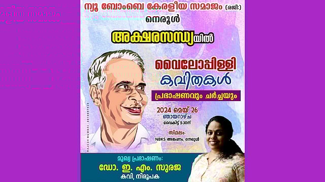 നവിമുംബൈ: ന്യൂ ബോംബെ കേരളീയ സമാജം നെരുൾ അക്ഷര സന്ധ്യയിൽ വൈലോപ്പിള്ളി കവിതകളുടെ പ്രഭാഷണവും ചർച്ചയും നടക്കും. മെയ് 26 ഞായറാഴ്ച വൈകീട്ട് 5.30 ന് എൻ ബി കെ എസ് ഹാളിൽ വെച്ചാണ് അക്ഷര സന്ധ്യ അരങ്ങേറുന്നത്.