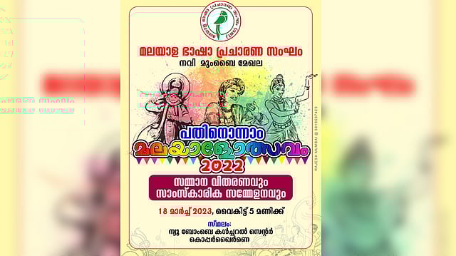 നവിമുംബൈ: മലയാളോത്സവം-2022 ലെ കലാ മത്സര വിജയികൾക്കും പ്രോത്സാഹന സമ്മാന അർഹരായവർക്കുമുള്ള സമ്മാന വിതരണവും സാംസ്കാരിക സമ്മേളനവും മാർച്ച് പതിനെട്ടിന് ശനിയാഴ്ച വൈകിട്ട് 5 മണിക്ക് നടത്തുന്നു. മലയാളഭാഷാ പ്രചാരണ സംഘം നവി മുംബൈ മേഖല ജനുവരി എട്ടാം തീയതി ന്യൂ ബോംബെ കേരളീയ സമാജത്തിൽ വച്ച് നടത്തിയ പരിപാടിയുടെ സമ്മാന വിതരണമാവും നടക്കുക. സമ്മാന വിതരണത്തോടനുബന്ധിച്ച് നടത്തുന്ന സാംസ്കാരിക സമ്മേളനത്തിൽ നഗരത്തിലെ ഭാഷാ, സാഹിത്യ, സാംസ്കാരിക നായകർ പങ്കെടുക്കുന്നു. ഒപ്പം കലാപരിപാടികളും ഉണ്ടായിരിക്കുന്നതാണ്