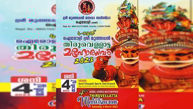 നവിമുംബൈ: മാർച്ച് 4 ശനിയാഴ്ച്ച ഐരോളി സെക്ടർ 19 ലെ സുനിൽ ചൗഗുലേ സ്പോർട്സ് ഗ്രൗണ്ടിലാണ് മുത്തപ്പൻ തിരുവെള്ളാട്ട മഹോത്സവം നടക്കുന്നു. അന്നേദിവസം രാവിലെ 5.30 ന് ഗണപതിഹോമത്തോട് കൂടി ചടങ്ങുകൾ ആരംഭിക്കുമെന്ന് ഭാരവാഹികൾ അറിയിച്ചു.