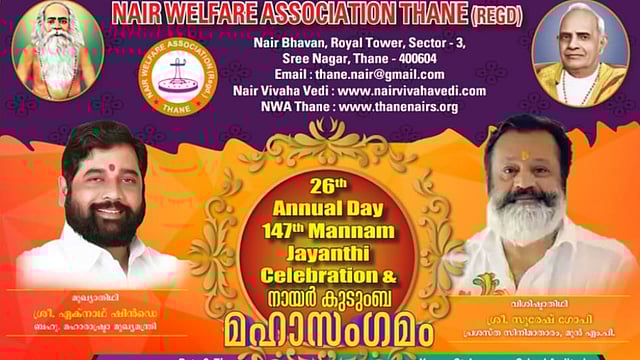 താനെ: താനെ നായർ വെൽഫെയർ അസ്സോസിയേഷൻ 26-മത് വാർഷികാഘോഷവും നായർ മഹാസംഗമവും ജനുവരി 28ന് ഞായറാഴ്ച താനെ ചെക്നാക്കയ്ക്കു സമീപമുള്ള സെന്റ്ലോറൻസ് സ്കൂൾ ഹാളിൽ നടക്കും. മഹാരാഷ്ട്രാ മുഖ്യമന്ത്രി എക്നാഥ്ഷിൻഡെ മുഖ്യാഥിതിയും പ്രശസ്ത മലയാളസിനിമ താരം സുരേഷ്ഗോപി വീശിഷ്ടാ തിഥിയും ആയിരിക്കും.രാവിലെ 9.30ന് അസ്സോസിയേഷൻ പ്രസിഡന്റ് ശ്രീകാന്ത് നായർ ഭദ്രദീപം തെളിയിക്കുന്നത്തോടെ ആഘോഷപരിപാടികൾക്കു തുടക്കമാകും.