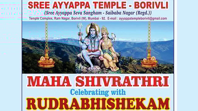 മുംബൈ: ബോറിവിലി അയ്യപ്പ ക്ഷേത്രത്തിൽ ശിവരാത്രി ദിനത്തിൽ രുദ്രാഭിഷേകം നടത്തപ്പെടുന്നു. മാർച്ച് 8 ന് വൈകീട്ട് 5.30 മുതലാണ് ചടങ്ങുകൾ ആരംഭിക്കുക. കൂടുതൽ വിവരങ്ങൾക്ക് Ph:9869831929