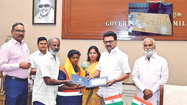 പദ്മയ്ക്കും ഭർത്താവിനും തമിഴ്നാട് മുഖ്യമന്ത്രി എം.കെ. സ്റ്റാലിൻ ഒരു ലക്ഷം രൂപയുടെ ചെക്ക് കൈമാറുന്നു.