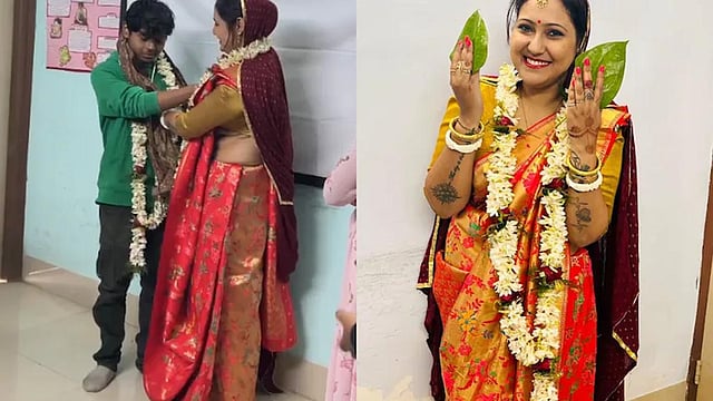അധ്യാപിക വധുവിനെ പോലെ ഒരുങ്ങി വിദ്യാര്ഥിക്കു മുന്നിൽ നില്ക്കുന്നതും, വിദ്യാർഥിയും അധ്യാപികയും പൂമാല പരസ്പരം കഴുത്തിലണിയുന്നതും, വിദ്യാര്ഥി അധ്യാപികയുടെ നെറ്റിയില് സിന്ദൂരം ചാര്ത്തുന്നതുമാണ് വിഡിയോയിലുള്ളത്. വിഡിയോ സമൂഹമാധ്യമങ്ങളില് പ്രചരിച്ചതോടെ കോളെജ് അധികൃതർ ഇടപെടുകയായിരുന്നു.