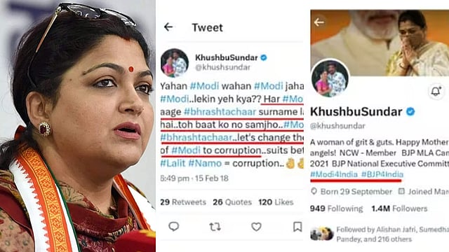 2018ൽ ഖുശ്ബു കോൺഗ്രസ് നേതാവായിരുന്ന സമയത്തുള്ള മോദി വിമർശനമാണ് ഇപ്പോൾ പുറത്തുവരുന്നത്. എല്ലാ അഴിമതിക്കാർക്കും മോദി എന്നു പോരുണ്ടെന്നായിരുന്നു ബിജെപി നേതാവ് ഖുശ്ബുവിന്റെ പോസ്റ്റ്. ബിജെപി നേതാവും ദേശീയ വനിതാ കമ്മീഷൻ അംഗവുമായ ഖുശ്ബുവിനെതിരെ ഇതിന്റെ പേരിൽ കേസെടുക്കാൻ ഗുജറാത്ത് മുഖ്യമന്ത്രി തയ്യാറാണോ എന്നാണ് കോൺഗ്രസ് നേതാക്കൾ ഇപ്പോൾ ഉയർത്തുന്ന ചോദ്യം.