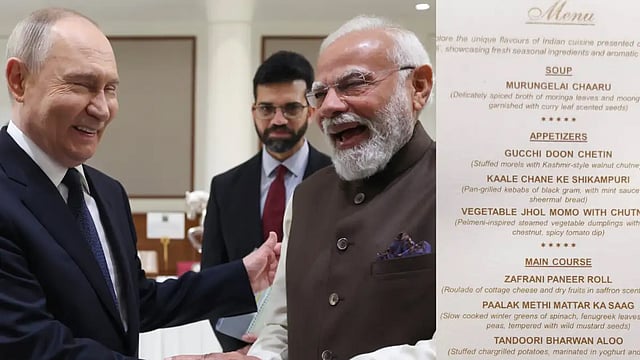 വെള്ളിയാഴ്ച രാഷ്ട്രപതി ഭവനിൽ പ്രസിഡന്റ് ദ്രൗപതി മുർമു ആതിഥേയത്വം വഹിച്ച അത്താഴവിരുന്നിൽ പ്രധാനമന്ത്രി നരേന്ദ്രമോദി, വ്ലാഡിമിർ പുടിൻ, കേന്ദ്ര മന്ത്രിമാർ, ഇരു രാജ്യങ്ങളിലെയും നയതന്ത്രജ്ഞർ എന്നിവർക്ക് വെജിറ്റേറിയൻ ഭക്ഷണമായിരുന്നു വിളമ്പിയത്.