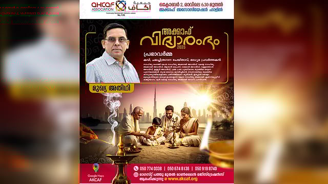 ദുബായ്: അക്കാഫ് അസോസിയേഷൻ സംഘടിപ്പിക്കുന്ന വിദ്യാരംഭം ചടങ്ങ് ഒക്ടോബർ 2 നു അസോസിയേഷൻ ഹാളിൽ നടത്തും. രാവിലെ 6.30 നു ആരംഭിക്കുന്ന ചടങ്ങിൽ പ്രശസ്ത കവിയും മാധ്യമ പ്രവർത്തകനുമായ പ്രഭാവർമ മുഖ്യാതിഥി ആയി പങ്കെടുക്കുകയും കുരുന്നുകൾക്ക് ആദ്യാക്ഷരം പകർന്നു കൊടുക്കുകയും ചെയ്യും.