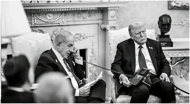വാഷിങ്ടൺ: വാഷിങ്ടണിൽ നടന്ന ട്രംപ്-നെതന്യാഹു കൂടിക്കാഴ്ചയുയെ ബ്ലാക്ക് ആന്ഡ് വൈറ്റ് ചിത്രങ്ങൾ സോഷ്യൽ മീഡിയയിൽ വൈറലാകുന്ന. ഓവൽ ഓഫീസിൽ തിങ്കളാഴ്ച നടന്ന ഈ യോഗത്തിനിടെ എടുത്ത ചിത്രത്തിൽ ട്രംപിന്റെ മടിയിൽ ടെലിഫോൺ സെറ്റ് ഇരിക്കുന്നതും റിസീവർ നെതന്യാഹുവിന്റെ കയ്യിലും കാണാം. കുറിപ്പുകൾ വായിച്ചു കൊണ്ട് ഫോണിൽ സംസാരിക്കു്നന നെതന്യാഹുവിന്റെ രൂപം ചിത്രത്തിൽ വ്യക്തമാണ്. ഖത്തർ പ്രധാനമന്ത്രി ഷെയ്ഖ് മുഹമ്മദ് ബിൻ അബ്ദുൾ റഹ്മാൻ അൽത്താനിയുമായുള്ള നെതന്യാഹുവിന്റെ സംഭാഷണമാണ് ഇതെന്നാണ് റിപ്പോർട്ടുകൾ. സാമൂഹിക മാധ്യമങ്ങളിൽ ഇപ്പോൾ ഉയരുന്ന ചോദ്യം ഇതൊരു തിരക്കഥയാണോ എന്നതാണ്. ഇസ്രയേൽ ദോഹയിലേയ്ക്കു നടത്തിയ അപ്രതീക്ഷിത ആക്രമണത്തിനു പിന്നാലെ നടന്ന ഫോൺ സംഭാഷണത്തിന്റെ പശ്ചാത്തലത്തിലാണ് ഈ വിവാദം. ഹമാസ് നേതാക്കളെ ലക്ഷ്യമിട്ടുള്ള ദോഹയിലെ ആക്രമണം ലോക രാജ്യങ്ങളെ ഞെട്ടിച്ചു. ഈ സംഭവത്തിനു പിന്നാലെ ട്രംപ് അടക്കമുള്ള നേതാക്കൾ നെതന്യാഹുവിനെതിരെ രംഗത്തെത്തി.
