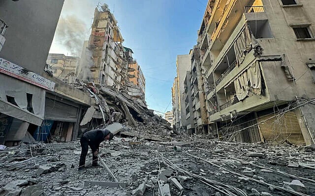 2026 മാർച്ച് 7 ന് ബെയ്റൂട്ടിന്റെ തെക്കൻ പ്രാന്തപ്രദേശങ്ങളിലെ ഹാരെത് ഹ്രെയിക് പരിസരത്ത് ഹിസ്ബുള്ളയെ ലക്ഷ്യമിട്ട് ഇസ്രായേലി വ്യോമാക്രമണം നടന്ന സ്ഥലത്ത് തകർന്ന കെട്ടിടങ്ങളുടെ അവശിഷ്ടങ്ങൾ ഒരാൾ പരിശോധിക്കുന്നു