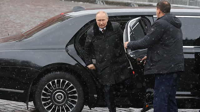 ബോംബാക്രമണം വരെ ചെറുക്കാൻ ശേഷിയുള്ള അതിസുരക്ഷാ ലിമോസിനിൽ നിന്നു പുറത്തേക്കിറങ്ങുന്ന റഷ്യൻ പ്രസിഡന്റ് വ്ളാദിമിർ പുടിൻ.