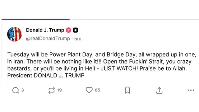 ഹോർമുസ് കടലിടുക്ക് തുറക്കാൻ നൽകിയ 48 മണിക്കൂർ സമയപരിധി അവസാനിരിക്കെയാണ് പുതിയ ഭീഷണി. ഇറാനിലെ പാലങ്ങളും ഊർജോത്പാദന കേന്ദ്രങ്ങളും തകർക്കുമെന്ന് പച്ചത്തെറിയുടെ അകമ്പടിയോടെയുള്ള ഭീഷണി.