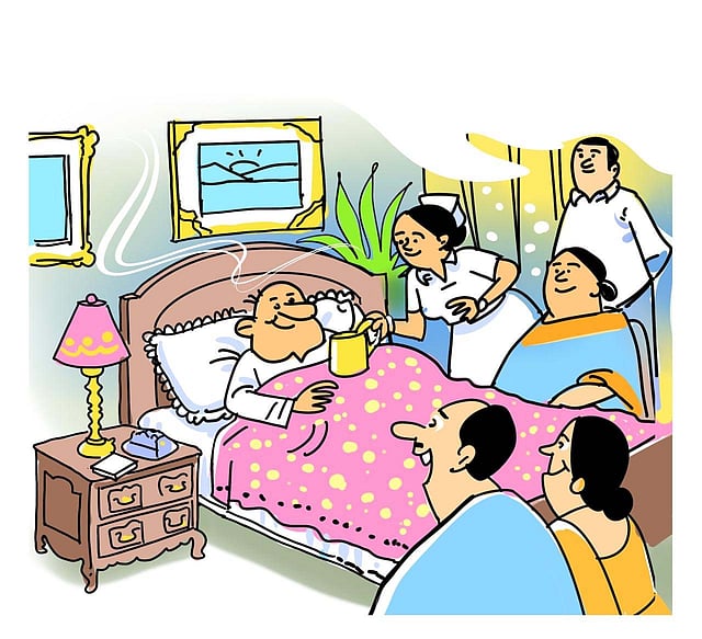 "അപ്പാപ്പന് സുഖചികിത്സയാണ്. ഇത്തരം ആശുപത്രിയിൽ എല്ലാവിധ പരിശോധനകളും നടത്താമെന്നു മാത്രമല്ല, വിശ്രമവും ഉല്ലാസവും ലഭിക്കുകയും ചെയ്യുമല്ലോ. കിഴി, ഉഴിച്ചിൽ, വസ്തി, ധാര, പിഴിച്ചിൽ, എണ്ണയിൽ സ്നാനം, സ്കാനിങ് എന്നീ നേരമ്പോക്കുകൾക്കക്കുള്ള അവസരവും ഇവിടെയുണ്ട് '- മുതലാളിയുടെ മകൾ പറഞ്ഞു.
