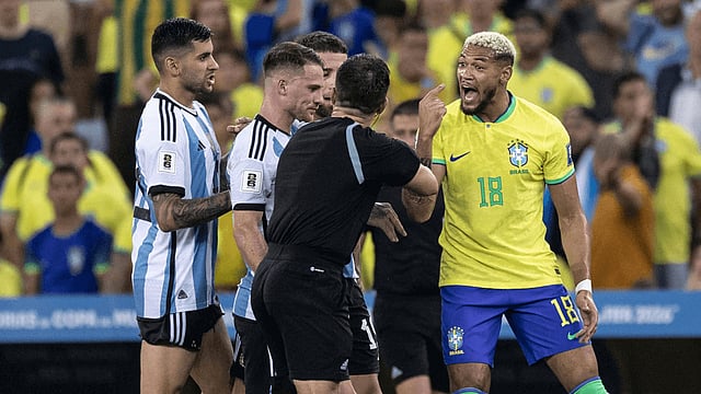 അർജന്റീന - ബ്രസീൽ മത്സരത്തിനിടെ പരസ്പരം കയർത്ത താരങ്ങളെ പിടിച്ചുമാറ്റുന്ന റഫറി.
