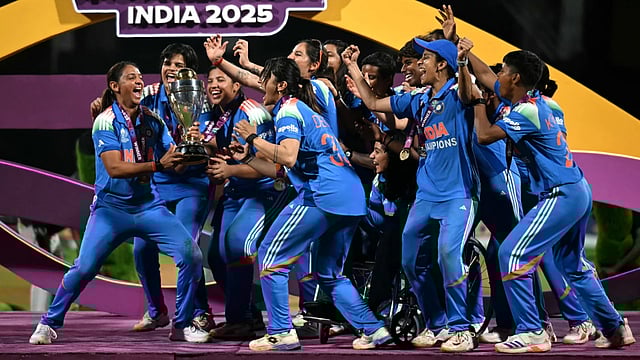 ലോകകപ്പ് ട്രോഫിയുമായി ടീമംഗങ്ങൾക്കൊപ്പം ആഹ്ളാദം പങ്കിടുന്ന ഇന്ത്യൻ ക്യാപ്റ്റൻ ഹർമൻപ്രീത് കൗർ.