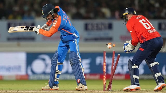 മറുപടി ബാറ്റിങ്ങിൽ ഇന്ത്യൻ ബാറ്റർമാർക്ക് ഒരു ഘട്ടത്തിലും ഇംഗ്ലണ്ട് ബൗളർമാരെ വെല്ലുവിളിക്കാനായില്ല. മൂന്ന് റൺസെടുത്ത സഞ്ജു സാംസൺ ആദ്യം പുറത്തായി. മൂന്നാം മത്സരത്തിലും ജോഫ്ര ആർച്ചർക്കു തന്നെ വിക്കറ്റ്. അഭിഷേക് ശർമ (24), സൂര്യകുമാർ യാദവ് (14), തിലക് വർമ (18) എന്നിവർ നന്നായി തുടങ്ങിയെങ്കിലും ഇംഗ്ലണ്ടിന്റെ കെണിയിൽ തന്നെ ചാടി.
