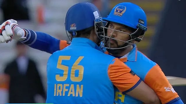 ഇർഫാൻ പഠാനും യുവരാജ് സിങ്ങും ലെജൻഡ്സ് ലീഗ് മത്സരത്തിനിടെ.