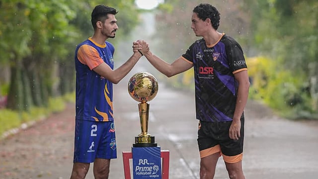 പ്രൈം വോളിബോള് ലീഗ് നാലാം സീസണിന്റെ ഫൈനല് പോരാട്ടത്തിന് മുന്നോടിയായി മുംബൈ മിറ്റിയോഴ്സ് ക്യാപ്റ്റന് അമിത് ഗുലിയയും ബെംഗളൂരു ടോര്പിഡോസ് ക്യാപ്റ്റന് മാറ്റ് വെസ്റ്റും ട്രോഫിക്കൊപ്പം ഫോട്ടോയ്ക്ക് പോസ് ചെയ്തപ്പോള്.