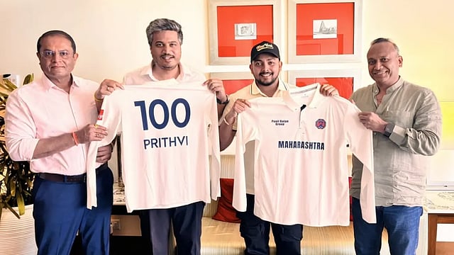 പൃഥ്വി ഷായ്ക്ക് മഹാരാഷ്ട്ര ടീമിന്റെ ജെഴ്സി ഔപചാരികമായി സമ്മാനിച്ചപ്പോൾ.