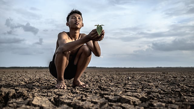 Boy sit on dry ground with his hands holding a seedlings looking at sky