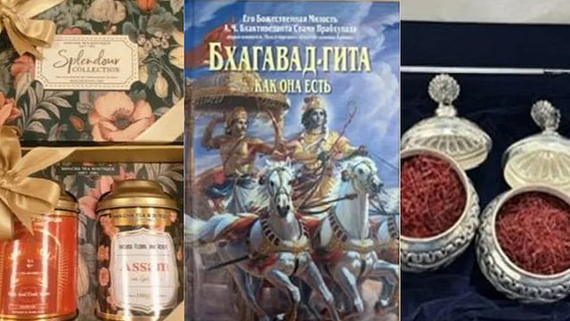രുചികരമായ അസം ബ്ലാക്ക് ടീ, ഏറ്റവും വിലയേറിയ കശ്മീരി കുങ്കുമപ്പൂവ്, കൈകൊണ്ട് നിർമ്മിച്ച വെള്ളിക്കുതിര, അലങ്കരിച്ച ചായ സെറ്റ്, ഭഗവദ് ഗീതയുടെ റഷ്യൻ പതിപ്പ് എന്നിവയാണ് പ്രധാനമന്ത്രി നരേന്ദ്ര മോദി റഷ്യൻ പ്രസിഡന്റ് വ്ളാഡിമിർ പുടിന് നൽകിയ സ്നേഹ സമ്മാനങ്ങള്. മഹാഭാരത യുദ്ധസമയത്ത് അര്ജുനന് ഭഗവാന് ശ്രീകൃഷ്ണന് നല്കിയ സാരോപദേശങ്ങളാണ് ഭഗവദ് ഗീത. ഭഗവദ് ഗീത റഷ്യന് ഭാഷയില് പരിവര്ത്തനം ചെയ്തതാണ് സമ്മാനിച്ചത്.