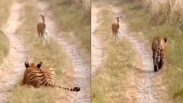 കാട്ടുവഴികളിലൂടെ വരുമ്പോള് ഒരു മാന് പെട്ടെന്നു കടുവയുടെ മുന്നില് അകപ്പെടുന്നു. വഴിയുടെ നടുവിലായി കിടക്കുകയായിരുന്നു കടുവ. ഓടണോ, വേണ്ടയോ, പുലിയുടെ വായിലകപ്പെട്ട് വീരചരമം പ്രാപിക്കണോ എന്നൊക്കെ ചിന്തിക്കാന് പോലും സമയമില്ല. എന്നാല് അത്രയും നേരത്തെ സ്വസ്ഥവിശ്രമത്തിനു ഭംഗം വന്ന വിധത്തില് കടുവ പതുക്കെ എഴുന്നേറ്റ് സൈഡിലൂടെ നടന്നു പോകുന്നു. പ്രിയ വിഭവം മുന്നില് വന്നു നിന്നിട്ടും മൈന്ഡ് ചെയ്യാത്ത കടുവ ഒരു സന്യാസിയാണെന്നു വരെ ട്വിറ്ററില് കമന്റുകള് നിറയുന്നുണ്ട്.