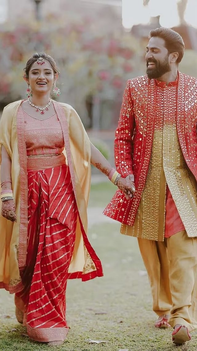 മഞ്ഞയും ചുവപ്പു നിറങ്ങളുള്ള വസ്ത്രങ്ങളായിരുന്നു ഇരുവരും ഹൽദിക്കായി ധരിച്ചിരുന്നത്.