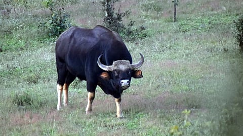 മധ്യ പ്രദേശിലെ പ്രശസ്തമായ ഹിൽ സ്റ്റേഷനായ പച്ച്മഡിയിലുള്ള ധൂപ്ഗഢിൽ നിന്നുള്ള കാട്ടുപോത്തിന്റെ ദൃശ്യം.